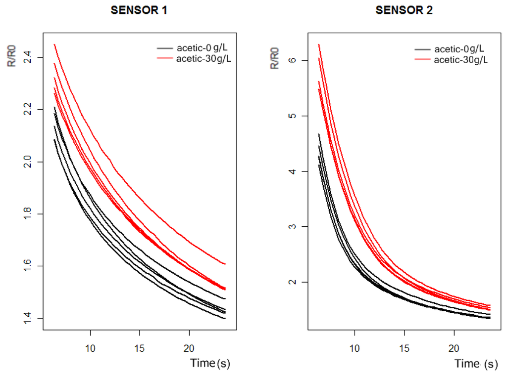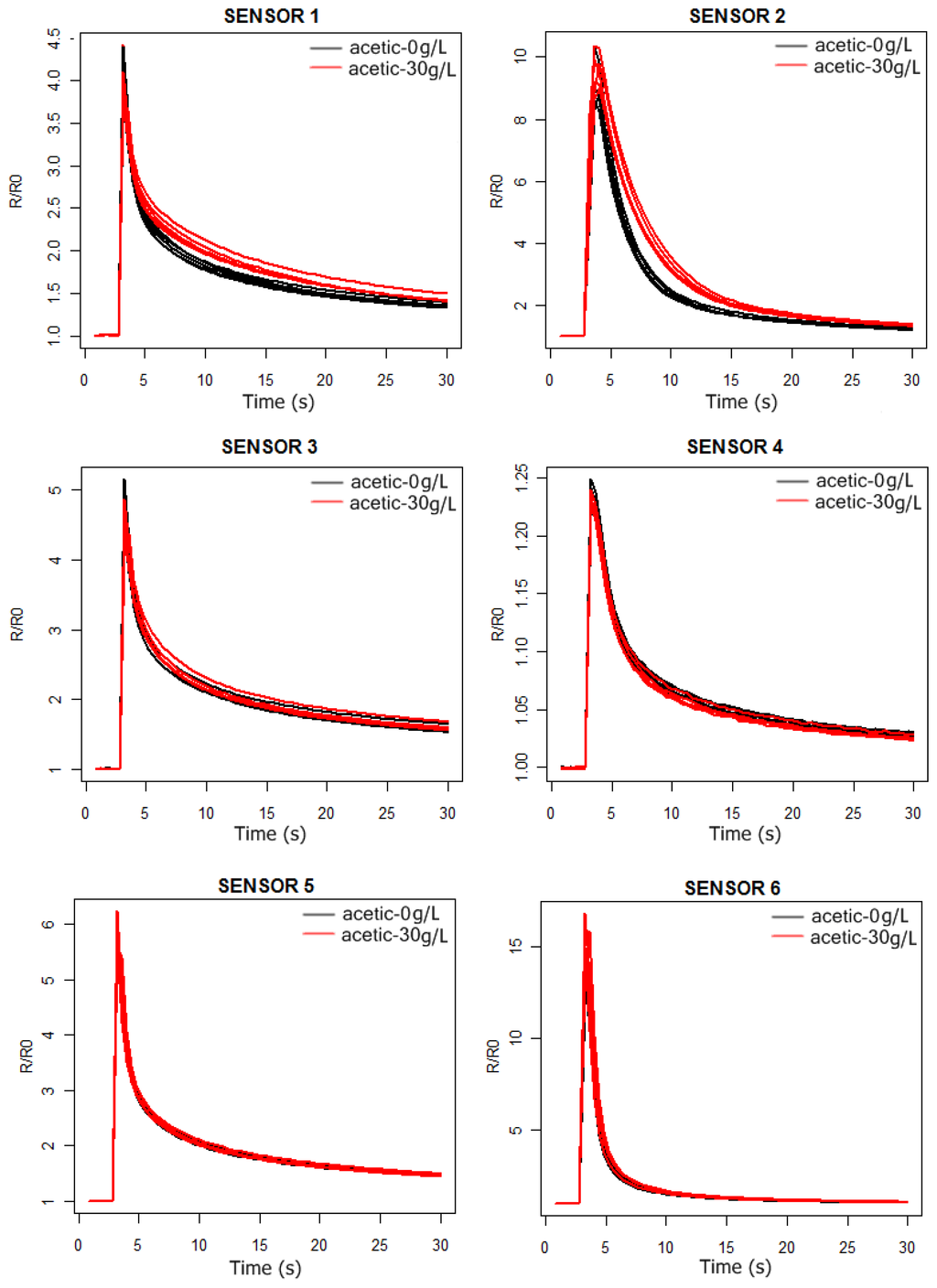 As can be observed in Figures 3 and 4, the probability of detecting the presence of acetic acid will be higher by using sensors 1 and 2. Furthermore, from Figure 5 we conclude that the more significant differences in the sensors responses happen between 6 and 24 s.