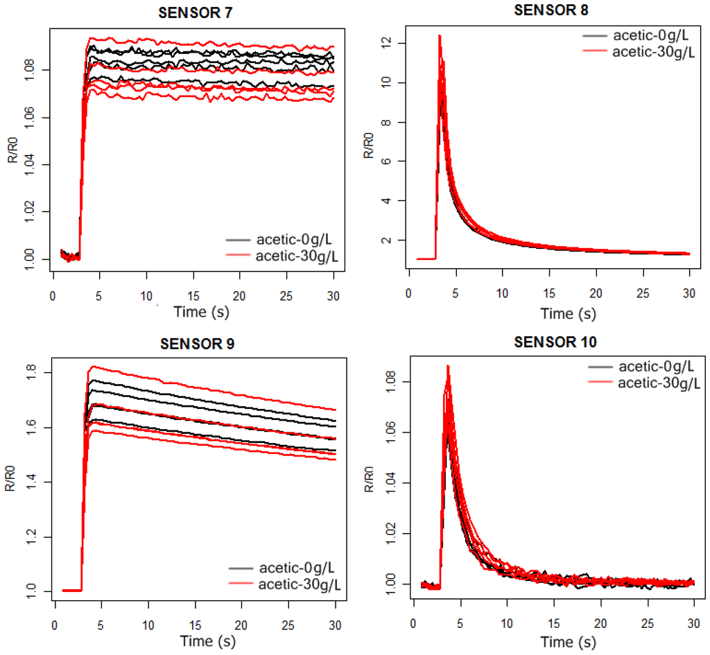 Sensor 7–10 response curves of the PEN3 electronic nose. Black: 10% aqueous ethanol solution. Red: 10% aqueous ethanol solution doped with acetic acid 30 g/L.
