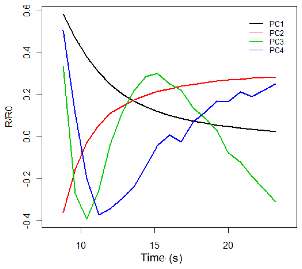 The original purpose of PCA was to reduce a large number of variables to a much smaller number of principal components (PCs), whilst retaining as much as possible the variation in the original variables. To do PCA of the response curves of Figure 5, we took 50 measurements, 25 for the synthetic wine samples doped with 30 g/L of acetic acid and 25 for the synthetic wine samples without acetic acid. If we only consider the sensor 1 and sensor 2 response curves at the interval of 6 to 24 s, we have a data matrix of 100 rows, (corresponding to 50 measurements of the sensor 1 and sensor 2), and 44 columns. Doing PCA of the data matrix we obtained the principal components (the autovectors of the covariance matrix). The first four principal components can be observed in Figure 6, and according to PCA, each initial response curve of Figure 5 can be decomposed as a linear combination of these autovectors or basis functions. The coefficients of the linear combination form the characteristic vector representative of each response curve.
