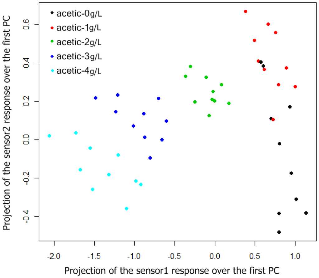 In Table 2, we can observe the proportion of the variance of the first four principal components. In this case, only the first PC accumulates 96.5% of the initial variance, and therefore we only used this component to characterize each response curve. This allows us, hereinafter, to represent each electronic nose measure by a two-dimensional characteristic vector that is composed of the projections of sensor1 and sensor2 response curves onto the first principal component.