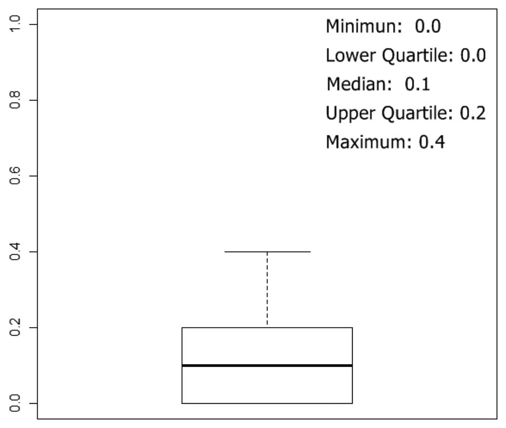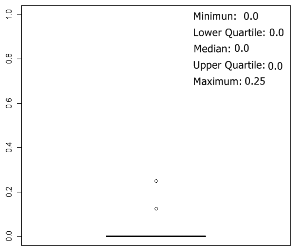 To estimate classification results, 5-fold cross validation method was used, and 10 rounds of cross-validation were performed, so we tested 50 neural network models. The box plot of the error over the test set of the 50 simulations can be summarized in Figure 8. The best results were obtained with networks with one hidden layer, and the mean of the number of neurons in the hidden layer, considering the 50 best networks (5 k-fold and 10 rounds of cross validation), were 29 neurons.
