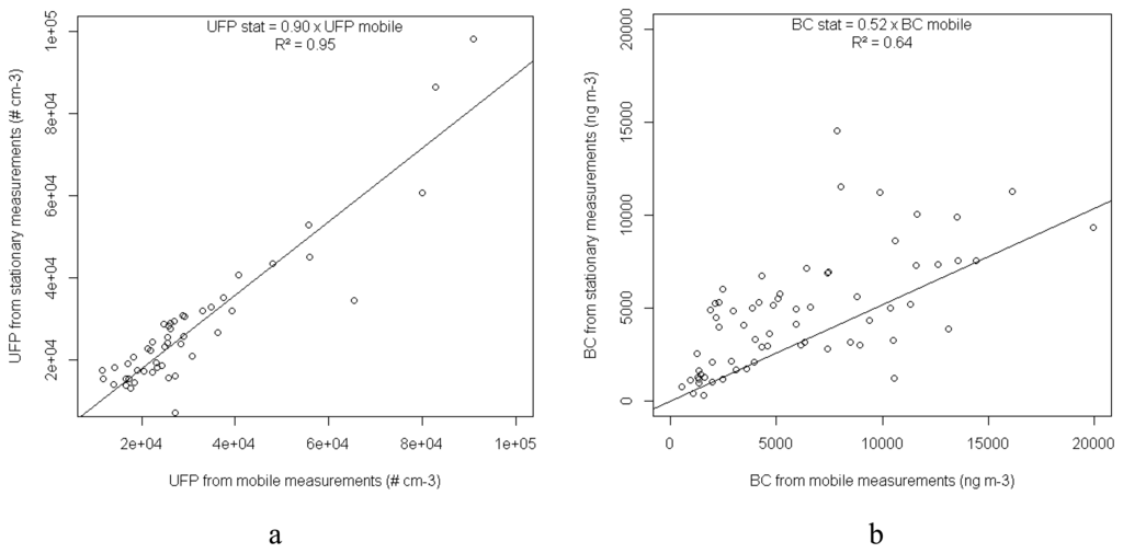 Scatterplots of mobile versus stationary UFP (a) and BC (b) measurements. Linear regressions are fitted to the data.