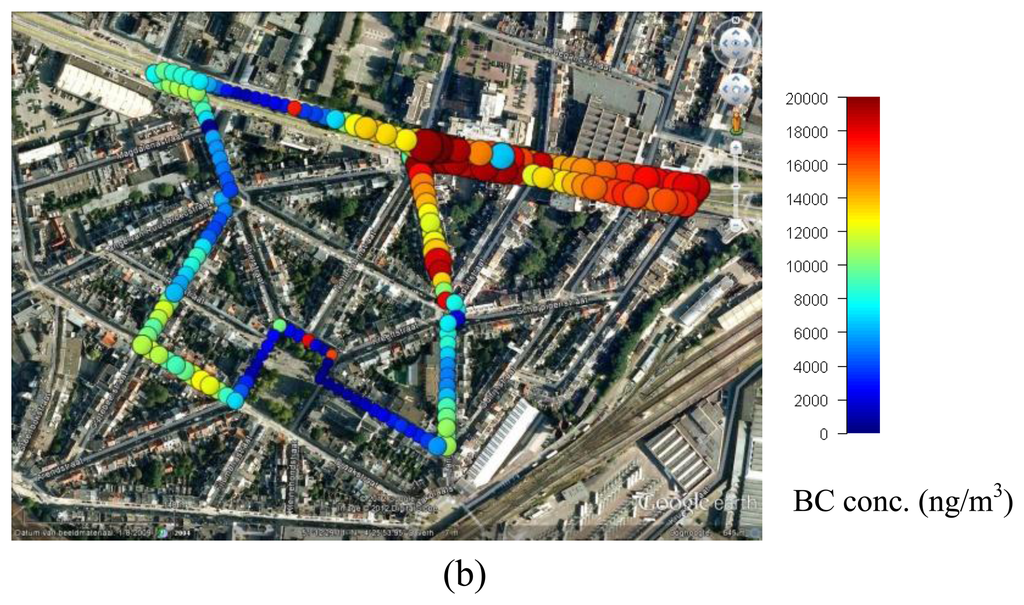 An appropriate measurement plan with repeated measurement runs in the same streets at well set times is required. This way, the spatio-temporal data can be aggregated by means of a summary statistic (median, mean) to obtain a more accurate estimation of the air quality. Obviously, the timing of the measurements is determined by the study objective. To investigate the exposure to air pollutants during commuting hours, measurements should be performed within this time frame on different days. Similarly, the mobile measurements should be distributed over the different hours of a day when the goal is to have a daily mean concentration [27]. Data aggregation results in smoother and probably more accurate maps of the air quality. For the case study presented in Section 5, the measurement runs have been conducted according to a strict measurement plan. When data is collected in a less structured way (e.g., with random measurement runs), it is more challenging to aggregate the collected data in a scientifically sound way.