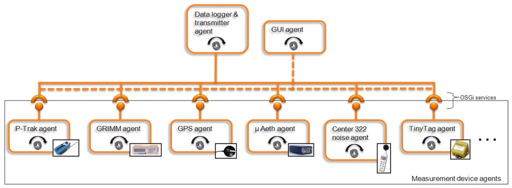 On the software side, the Aeroflex software platform has to be able to support an “ever changing” set of measurement devices by detecting new instruments automatically. To meet those requirements, we implemented an autonomous “Measurement device agent” for each measurement device which is responsible for all device specific tasks, including detecting the port(s) on which the measurement device is present, reading out the measurements, and reading out the error codes of the measurement device if available. Each agent is implemented in Java as a separate Open Service Gateway initiative (OSGi) bundle [26] which can be added and removed when needed. Every second, the “Data logger and transmitter agent” pulls the measurements from the “Measurement device agents”. All measurement devices can be read out simultaneously thanks to execution of their “Measurement device agents” in separate execution threads. Also, the “Data logger and transmitter agent” logs the measurements to a data file and/or transmits them over the Internet to the Aeroflex data backend (see Section 3.1). The “GUI agent” is responsible for drawing and updating the graphical user interface. All agents operate completely autonomously in their own thread and are only loosely coupled to each other through OSGi services. An overview of the software platform on the Aeroflex is shown in Figure 2.