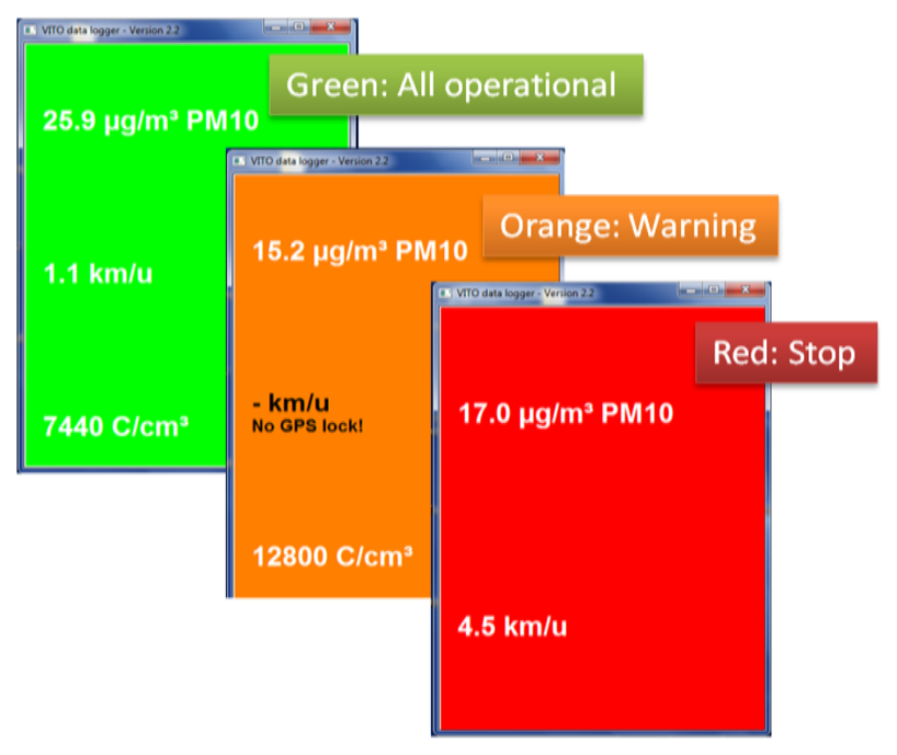 In contrast to consumer electronics, air quality measurement devices and their software are often not designed to be very easy to use. This is typically not a big problem since in most cases the technical staff performing the measurements is trained to operate the measurement devices. For the Aeroflex, being easy to use is a key requirement. Everybody who “can ride a bike” should be able to conduct air quality measurements with the Aeroflex. Incorrectly started measurement devices, badly connected cables and device failures during the measurements occurred more frequently than anticipated during the initial test rides. Too often measurement rides had to be redone due to lacking data. Initial experiments with sound alarms to inform the Aeroflex user on failure produced unsatisfying results. Too much noise is present in urban traffic environments to inform the user by sound signals. More success has been obtained by adding a “traffic light” user interface. The display on the handlebars colors green when all measurement devices are operating correctly. It changes color to orange when warnings are present such as “no GPS lock” or minor warnings from measurement devices. And, it changes color to red when measurements should be stopped immediately because of a failing measurement device or cable connection. The concept of a traffic light is quite naturally understood by the persons conducting the mobile measurements: they literally get a “green light” when the Aeroflex is fully operational and mobile measurements can be conducted. Furthermore, the “traffic light” user interface turned out to be easier to observe while biking compared to showing a text message or playing a sound signal.