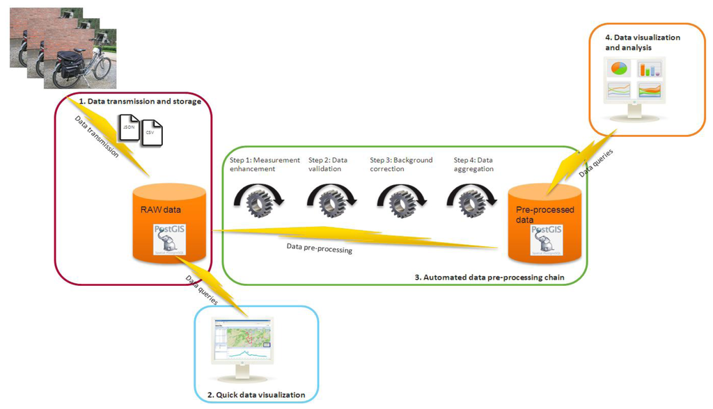 Before the measurement data is ready for analysis and final visualization, a number of automated data pre-processing steps have to be executed. Currently we have realized a prototype version of an automated data pre-processing chain with four processing steps as illustrated in Figure 4. In the first step, the measurements are enhanced where possible. This includes interpolation and flagging of lacking GPS locations and noise reduction of the microAethalometer black carbon measurements using the ONA algorithm [24]. In the second step, the data is validated by removing incorrect measurements. During the third data pre-processing step, mobile air quality measurements are corrected for available background concentrations. The need for this data pre-processing step is explained in depth in Section 4. In the last step, the measurements are spatially aggregated for each road segment. The results of the data pre-processing chain are stored in a PostGIS database.