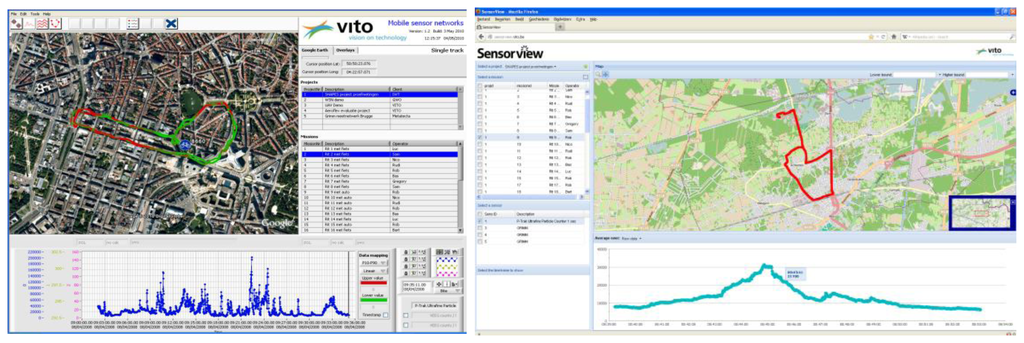 With the Aeroflex, we solved this issue by making an automated visualization available of the raw measurement data. Each measurement trip is individually visualized on maps and graphs by a LabView based desktop application (Figure 5, left). The Aeroflex measurements can also be visualized on the new VITO SensorView web application, removing the requirement for software installation (Figure 5, right). The applications make use of respectively the OGC Web Feature Service (WFS) and the OGC Web Mapping Service (WMS) to display the measurements. Both web services are offered by a GeoServer instance.