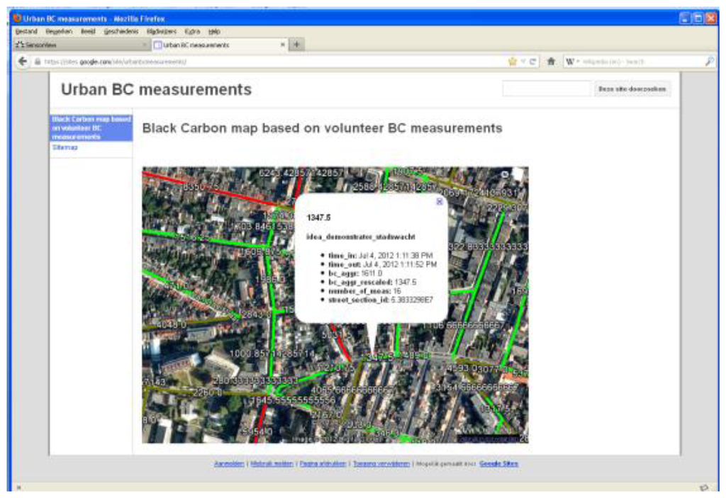 The pre-processed data is ready for further analysis and visualization. This step is known to be very project dependent. The research goals of the project determine which analyses and visualizations are required. In Section 5, a limited data analysis is presented of an example of a monitoring campaign using the Aeroflex. For some projects, an automated custom visualization may be required. Figure 6 shows a web visualization of a black carbon map. A BC concentration is assigned to each street based on all mobile BC measurements. Each time new mobile BC measurements are added, the map is automaticaly updated. A GeoServer and the Google Earth plug-in have been used for the automated construction of this webbased BC map.