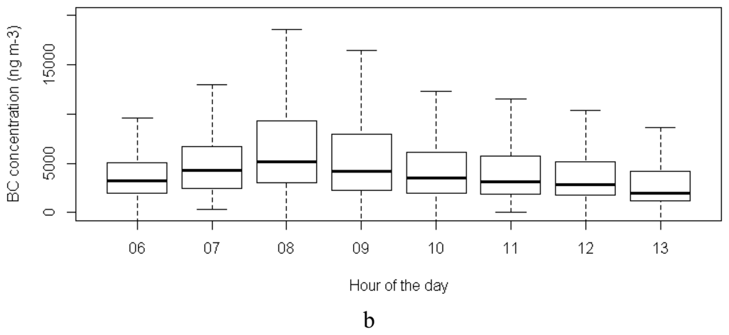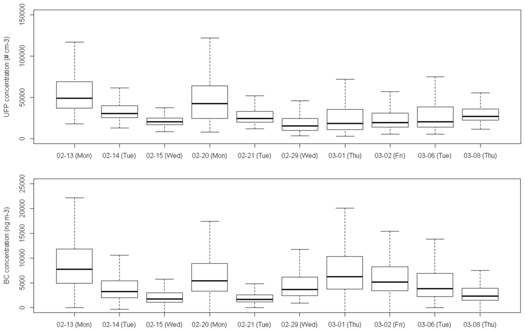 The temporal variability in UFP and BC concentrations is present at different levels: between days, between hours of the day and between seconds. Different processes are generally involved in the temporal dynamics of UFP and BC. Local processes related to temporal source dynamics (in urban areas mainly the traffic dynamics), fast transformation processes, e.g., for ultrafine particles or nitrogen oxides, and local atmospheric dispersion cause rapid changes in pollutant concentrations at the local scale, whereas larger scale atmospheric processes determine changes in urban background concentration at a lower spatial and temporal resolution. A comparison of the concentrations grouped by measurement day suggests significant temporal changes (Figure 7). The highest UFP concentrations were measured on February 13th and 20th and the 1st of March, the lowest on February 15th and 20th. The temporal pattern of BC concentrations was similar to that of the UFP concentrations, except for the second BC peak at the beginning of March, which was not observed for UFP. Changes in the urban background account partially for this day-to-day variability. Some of the temporal variability could also be explained by the day of the week. Recently collected traffic count data from a side street of the Plantin en Moretuslei (Provinciestraat, not along the monitoring track) showed increased traffic densities on Mondays.