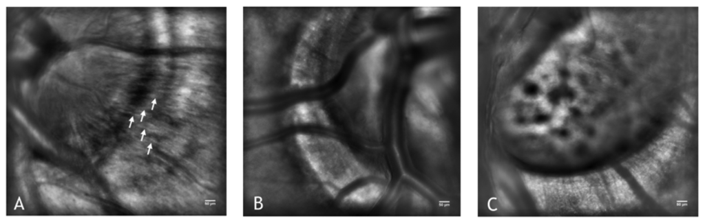 AO retinal images with adaptive compensation of the photoreceptor layer (A), vasculature (B) and retinal nerve fiber layer (C). Scale bars represent 50 μm. The blood vessels form a three-dimensional network across the inner retinal layers. All the images shown in this review have been acquired using a flood-illumination AO retinal camera (rtx1, Imagine Eyes, Orsay, France).
