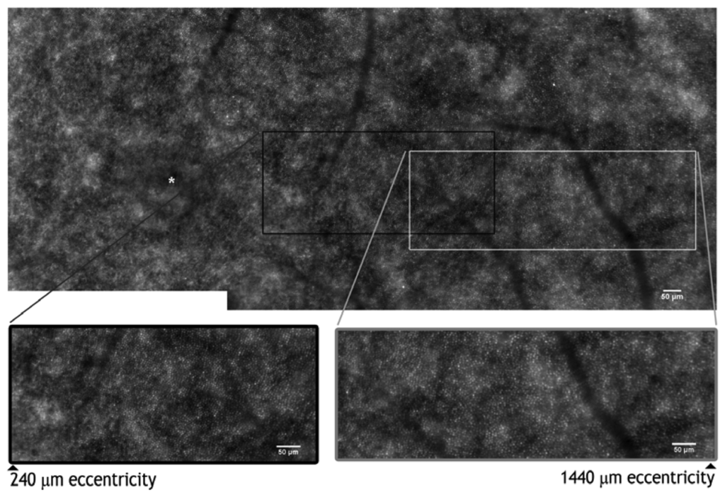 AO montage of the photoreceptor mosaic in a 46 year old subject. The asterisk shows the foveal center. The black and grey boxes enclose two high-magnification images of the photoreceptor layer from 240–1,440 μm eccentricities from the foveal center. The center-to-center distance between cones has been shown to increase with greater eccentricities from the fovea; the cone density, accordingly, declines with increasing eccentricity from the fovea. Scale bars represent 50 μm.