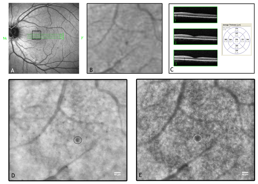 (A) Wide-field SLO image of the left eye in a 38-year old female patient with type 1 diabetes and mild non proliferative diabetic retinopathy. (B) High-magnification SLO image of a region of interest (encircled in A, 0.88 × 1.53 mm) showing a micro-haemorrhage, though with low resolution. (C) The SD-OCT horizontal scans of the central retina, corresponding to the green lines superimposed to the SLO image in A show a preserved retinal microstructure. The retinal thickness map is also shown. (D and E) The same region of interest imaged by an AO system with adaptive compensation of the vessels and photoreceptor layer, respectively. Scale bars represent 50 μm. In (D), the small arterioles and the capillaries create a web between larger vessels; the spot haemorrhage (encircled) shows distinct margins. In (E), the AO image of the cone mosaic. The haemorrhage projects a dense shadow, with defocused margins, onto the mosaic completely masking the underlying photoreceptors.