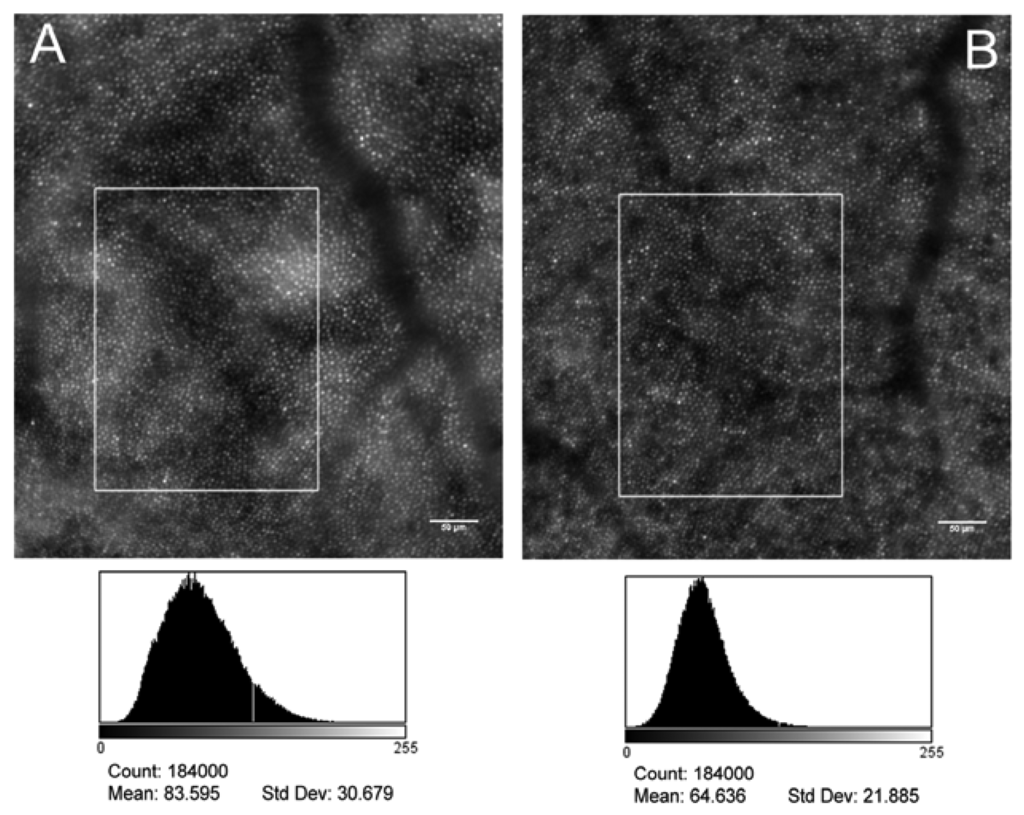 AO images, both centered at coordinates: x = 1.5° temporal and y = 1.8° superior from the fovea, of the photoreceptor mosaic in the left eye of a patient with type 1 diabetes without clinical signs of diabetic retinopathy (A, 36 years old female, noDR eye) and a healthy control (B, 37 years old female). Scale bars represent 50 μm. In the lower row, the image histograms (x-axis: 0–255 grey level; y-axis: pixel intensity level) of the selected areas are shown: both a higher average and a higher standard variation of the intensity level distribution of pixels was found in the noDR eye than in control. Biological and technical factors can contribute to variations in brightness between adjacent domains of photoreceptors.