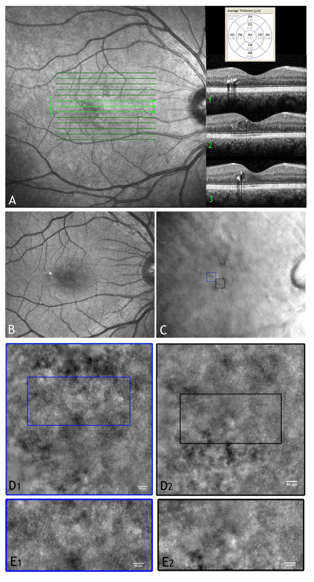 (A) Wide-field SLO image and OCT scans of the right eye in a 49 year old patient with mild non proliferative diabetic retinopathy showing hard exudates and a focal macular oedema. (B and C) Wide-field digital images (retromode modality by F10, Nidek, Japan) of the posterior pole showing the locations of the retinal exudate and the micro-cystic oedema (black box), respectively. (D1 and D2) Adaptive optics images of the photoreceptor layer acquired within the regions of interest enclosed in C (scale bars represent 50 μm). In panel D2, cones are highly resolved only in part probably due to increased scattering from oedematous inner retinal layers. (E1 and E2) High-magnification images of the photoreceptor layer shown in D1 and D2 respectively (scale bars: 50 μm). High variations in brightness between adjacent domains of photoreceptors can be seen in regions close to retinal oedema (E1). Intraretinal oedema reduces high-resolution imaging of photoreceptors (E2).