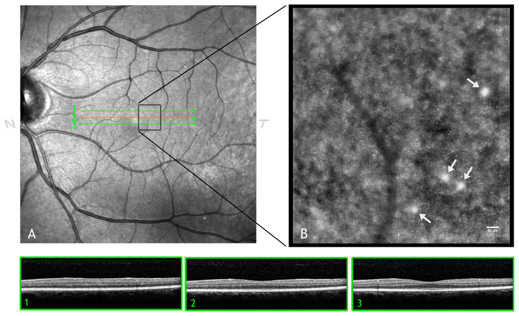 (A) Wide-field SLO image of the left eye in a 49 year old male showing hard drusen located near the fovea. The SD-OCT horizontal scans (1, 2 and 3) of both the photoreceptor and retinal pigment epithelial (RPE) layers have almost normal appearances. (B) AO image of the region of interest showing drusen (white arrows). The cone photoreceptors above drusen are well resolved, showing a higher brightness than adjacent cones. Similar findings have been shown using AOSLO (References [–]). Scale bar: 50 μm.