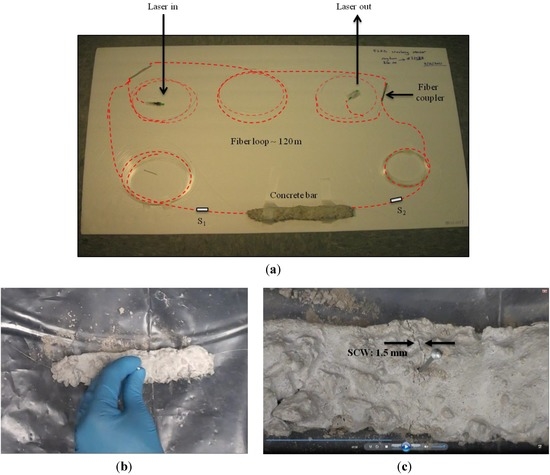The picture in Figure 3(a) shows a FLRD sensor unit constructed for the experiment. The concrete bar was spliced to the fiber loop through the junctions S1 and S2, as shown in the figure. A laser pulse was injected into the loop through the FC/APC connector on the input arm of the fiber loop. The output arm of the loop was connected to a photodiode detector. The ringdown decay waveform was monitored by an oscilloscope which was connected to a laptop computer for data processing.