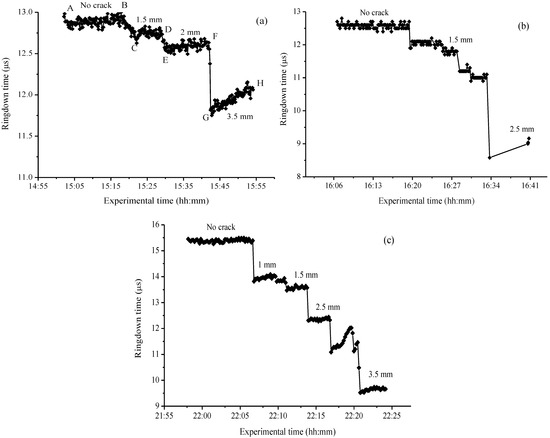 Similar were the observations for sensor unit-2 and unit-3. Experimentally, the difference among the three sensor units was the production of controlled cracks. Unlike in unit-1, relatively controlled cracks were produced in the sensor units-2 and 3; and both sensor units responded promptly to an every cracking event generated on the top surface of the bar. A uniform step-wise increase of 0.5 mm in SCW was achieved with both the sensor units, as shown in Figure 5(b,c). A substantial decrease in ringdown time in each increasing step in SCW was noted with near real-time response (1.5 s). Conservatively, both sensor units can be considered to be sensitive to a SCW of 0.5 mm or smaller. This estimation is based on the fact that the production of a SCW smaller than 0.5 mm in each step could not be achieved and controlled in the present experimental situation. However, considerable changes in ringdown time for a SCW of 0.5 mm in each step, as shown in Figures 5(b,c), indicate that the sensor could theoretically be much more sensitive in terms of response to a much smaller SCW. This speculation drives a further consideration of a theoretical detection sensitivity of sensors in terms of a minimum detectable SCW (described in the section below).