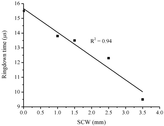 In the case of unit-1, a decrease of 0.2 μs in ringdown time was observed when the SCW increased from 0 (no crack) to 1.5 mm. However, the next cracking event increased the SCW to 2 mm; an increment of 0.5 mm. An equal decrease of 0.2 μs in ringdown time was recorded. This suggested that once the crack on the surface propagated down to the optical fiber location, the sensor exhibited a SCW detection sensitivity of 0.5 mm.