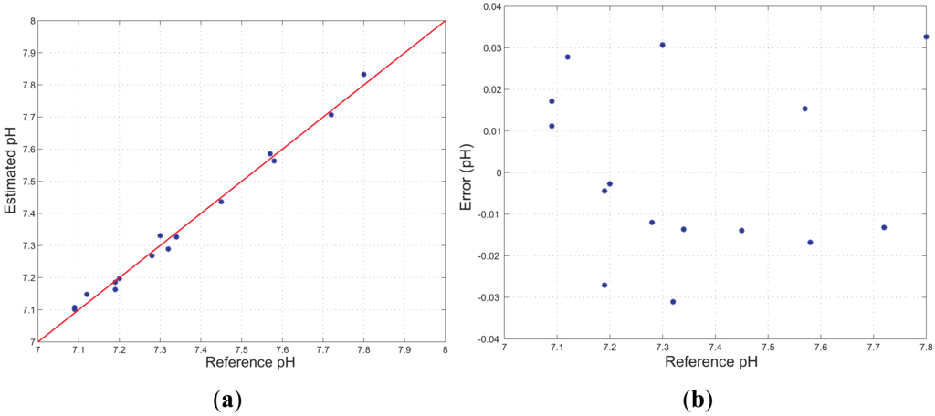 (a) Estimated versus reference pH and fitting line. (b) Difference between estimated and reference pH versus reference pH.