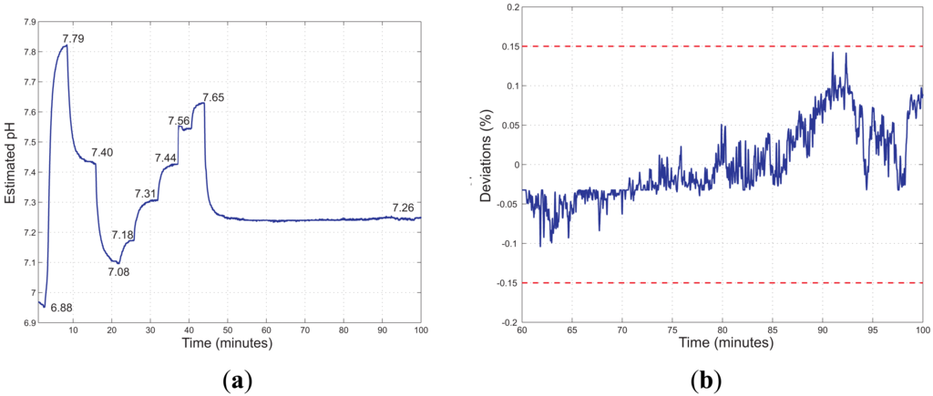 Figure 11(a) shows the estimated pH values, determined through Equation (7), versus time acquired firstly changing the pH of the solution and then keeping it constant. Assuming that the pH of the solution is completely stabilized at t = 60 min, the short term stability can be determined by evaluating the deviations of the estimated pH respect to its mean value in the time interval 60–100 min. As shown in Figure 11(b), no significant drifts have been observed in this time interval; all deviations are within 0.15% of the mean value of the estimated pH.