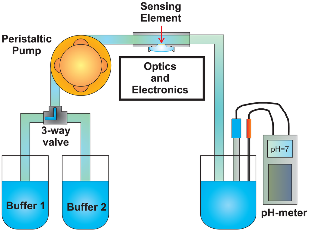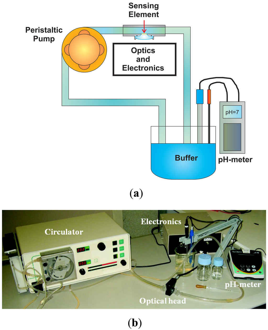 In order to test the sensor, a fluidic system has been realized. As shown in the schematic representation in Figure 6(a) and in the picture in Figure 6(b), it consists of (i) a closed loop circulator, (ii) the optical head with the sensing element inside, (iii) a beaker with a reference glass electrode pH-meter (Eutech Instruments, XS pH 700, Nijkerk, The Netherlands) to measure the pH of the solution and a thermocouple to measure the temperature of the solution and correct the pH value.