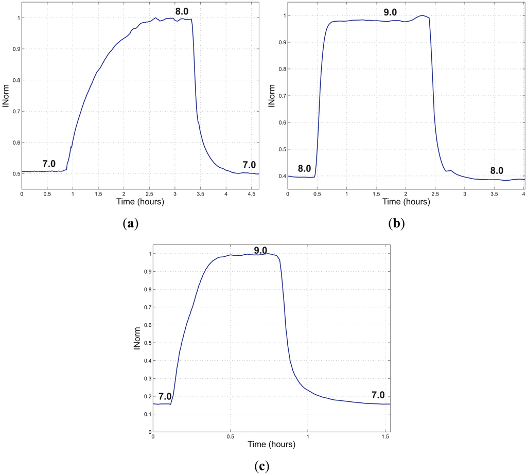 INorm versus time acquired during the three tests performed to evaluate the response time of the sensor and its dependency on the pH value. (a) Sensor response to a change in pH from 7 to 8 and back; (b) sensor response to a change in pH from 8 to 9 and back; (c) sensor response to a change in pH from 7 to 9 and back.