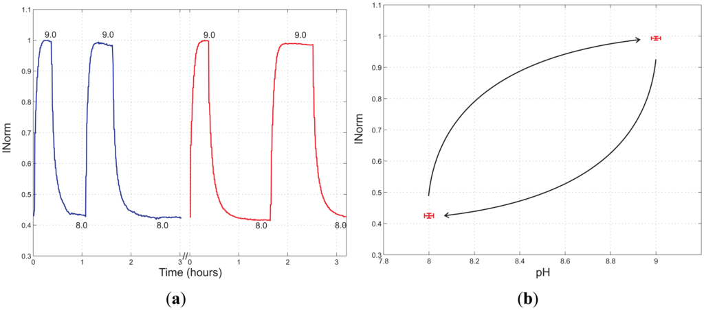 The reproducibility of the pH sensor has been evaluated using the fluidic system represented in Figure 12, by changing the pH between the same two buffer solutions, i.e., 8.0 and 9.0 (Fisher, Sigma-Aldrich, Milan, Italy). In Figure 14(a), INorm versus time is reported. The first test (blue) was performed the day before the second test (red), using the same polymer sensing element. In Figure 14(b) the mean values of the INorm signal, measured at pH = 8.0 and pH = 9.0, are reported, together with the error bars.