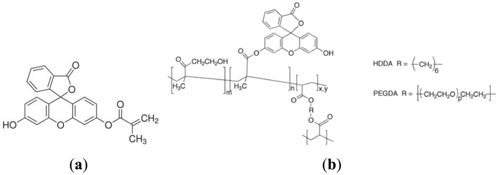 All chemicals needed for the realization of a hydrophilic, highly swellable polymer matrix containing an optical sensing element were of analytical grade, purchased from Sigma-Aldrich (Milan, Italy) and used without further purification. All aqueous solutions were prepared using distilled water. The matrix was prepared by the free-radical polymerization of 2-hydroxyethyl methacrylate (HEMA), whose thermodynamic affinity for water is well known [20], catalysed by the radical photoinitiator 4-(2-hydroxyethoxy)phenyl-(2-hydroxy-2-propyl)ketone (Irgacure 2959, BASF, Ludwigshafen, Germany), used at 1.0% wt. The polymerization was run in the presence of a tetrafunctional monomer, namely 1,6-hexanediol diacrylate (HDDA) added at 5.0% wt with respect to HEMA, acting as crosslinker to avoid an excessive swelling degree of the acrylate matrix in contact with water, which could result in a poor mechanically resistance. Fluorescein O-methacrylate 97% (Figure 2(a)) was added to the acrylates mixture at 1.0% wt with respect to HEMA monomer; its methacrylate moiety allows for a covalent inclusion of the fluoresceine comonomer within the swellable polymer matrix, thus suppressing the severe drawback of indicator leaching. The covalent bonding between the HEMA matrix and the fluorescent dye is depicted in Figure 2(b). The overall swelling ratio of the polymer matrix in aqueous solutions was finely tuned by adding different amounts (up to 6.0% wt) of a flexible macromer, namely poly(ethylene glycol) diacrylate (PEGDA, Ebecryl13, Cytec Industries, Woodland Park, NJ, USA), to further improve the polymer chain flexibility, and in turn ion mobility within the polymer matrix [21]. The mixture of chemicals was accurately mixed using a magnetic stirrer before being deposited by spin coating (500 rpm, 30 s) onto a transparent PVC substrate (Figure 3(a)), and cured by UV-irradiation with a medium pressure mercury lamp under nitrogen with a light intensity on the surface of the sample of 30 mW/cm2 for different time up to 70 s.