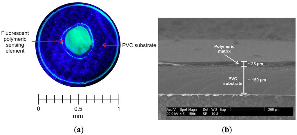 (a) Top-view picture of the hydrophilic polymer matrix including the fluorescent indicator, used as the sensing element, excited by a blue LED. (b) SEM cross-section picture of the hydrophilic polymer matrix including the fluorescent indicator, used as the sensing element.