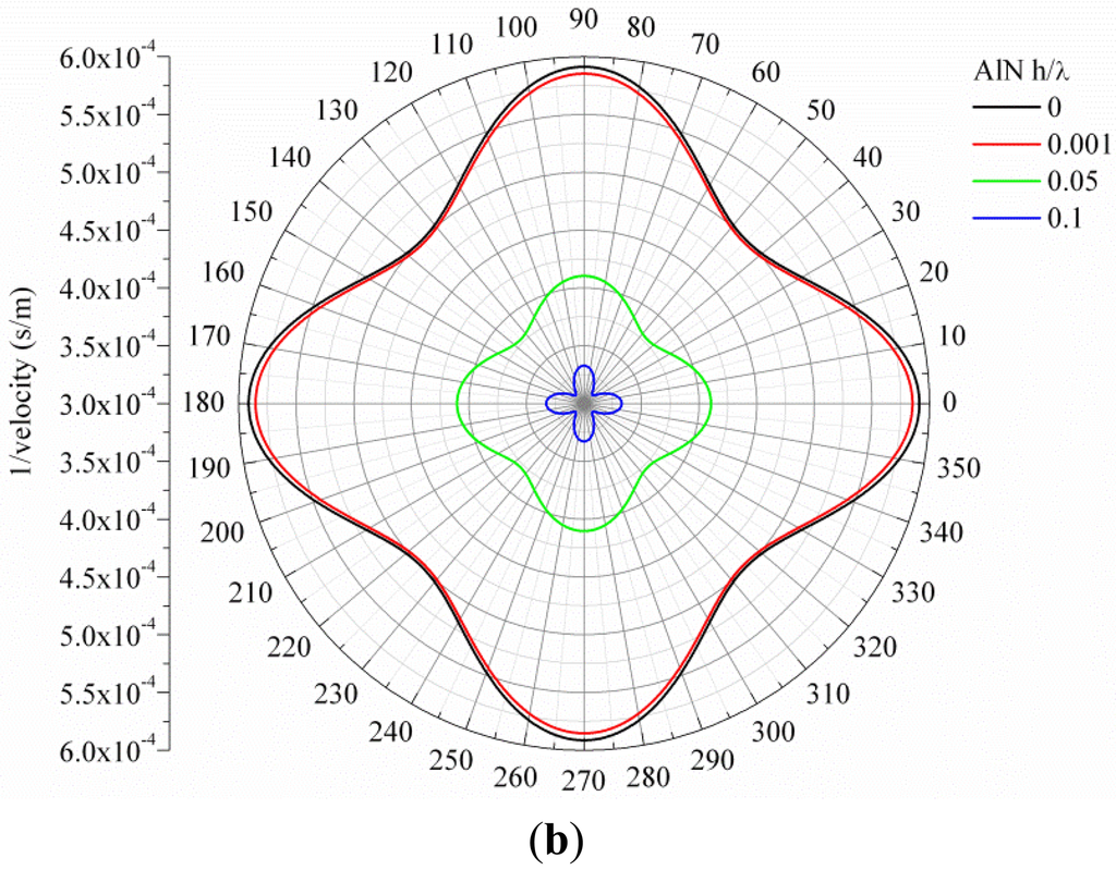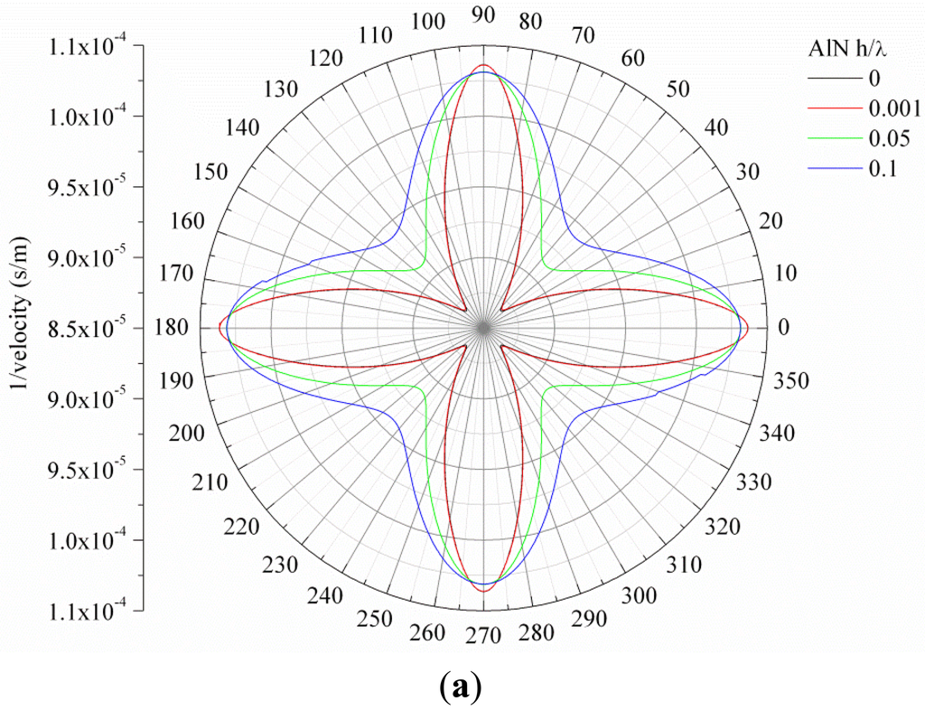 Figure 1(a,b) show, as an example, the slowness curve of the S0 and A0 modes propagating along 3C-SiC/c-AlN composite plate for SiC thickness-to-wavelength-ratio h/λSiC = 0.1 and AlN normalized thicknesses h/λAlN = 0, 0.001, 0.05 and 0.1.