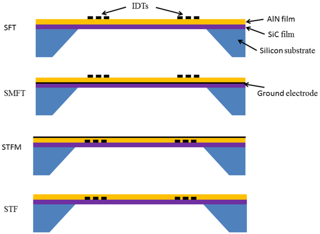 In the AlN/SiC composite plate, four piezoelectric coupling configurations can be obtained by placing the IDT's at the substrate/film interface (Substrate/Transducer/Film, STF), at the film surface (Substrate/Film/Transducer, SFT), farther including a ground electrode opposite the IDTs (Substrate/Transducer/Film/Metal and Substrate/Metal/Film/Transducer, STFM and SMFT). The four coupling configurations are shown in Figure 3.