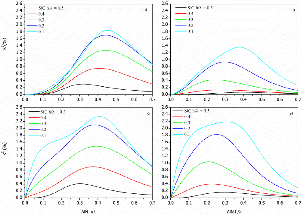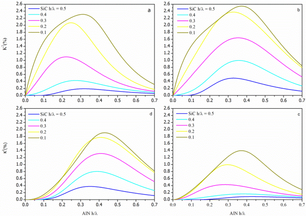 for the SFT, SMFT, STF and STFM configurations, respectively, being the SiC and the AlN layers represented as the Substrate and the Film, respectively. The K2 dispersion curves (K2 vs h/λAlN) of each AlN/SiC-based configuration were calculated for different h/λSiC values and for the <100> and <110> propagation directions. The calculated data addressing the AlN/SiC(001)<100> and AlN/SiC(001)<110> are shown in Figures 4 and 5, being the h/λSiC the running parameter.