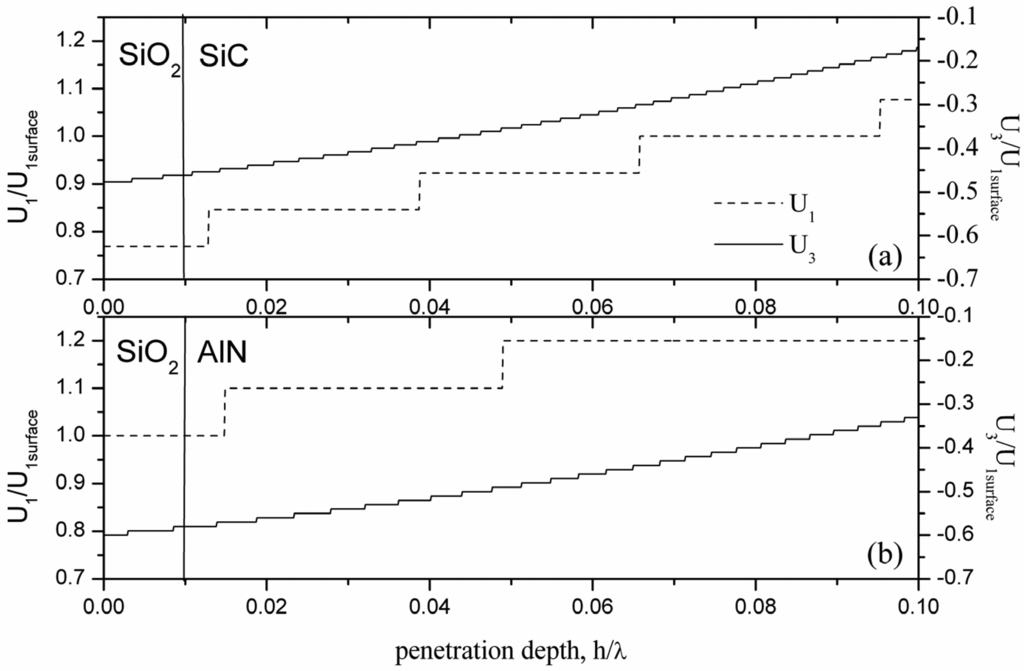 The normalized particle displacement components vs. the penetration depth (calculated by 0.0001 h/λ steps) along the (a) SiO2/SiC and (b) SiO2/AlN interfaces of the AlN/SiC(001)<110>-SFT plate.