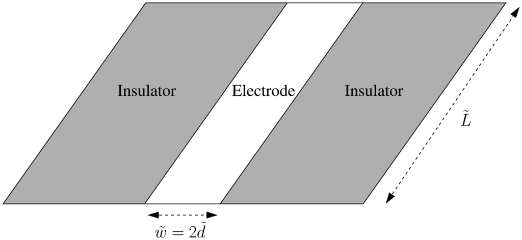 Cartoon of an inlaid microband electrode of width w̃ = 2d̃ and length L̃. The axial length, L̃, of the electrode is much greater than the width, w̃, i.e., L̃ ≫ w̃. Then, for time-scales t̃ such that t̃ ≪ L̃2/D̃, where D̃ is the typical size of the diffusion coefficients of the redox species, this allows the two-dimensional-diffusion approximation to be used, since contributions to the current from the three-dimensional diffusion at the ends are negligible.