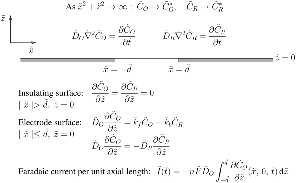 Here D̃ is the typical size of the diffusion coefficients of the oxidant and the reductant, D̃O and D̃R, and β is given by Equation (2). We remark that we have scaled time with the diffusive time-scale associated with the dimensions of the width of the electrode; over time-scales of this order, the diffusion can be regarded as two-dimensional.