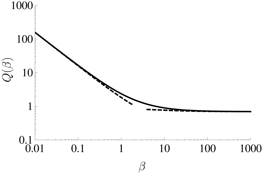Log-log plot of the function Q(β). The solid line has been calculated numerically as described in Section 2.2, and the dashed lines have been plotted using the asymptotic expressions given by Equation (62) for β ≪ 1, and Equation (63) for β ≫ 1.