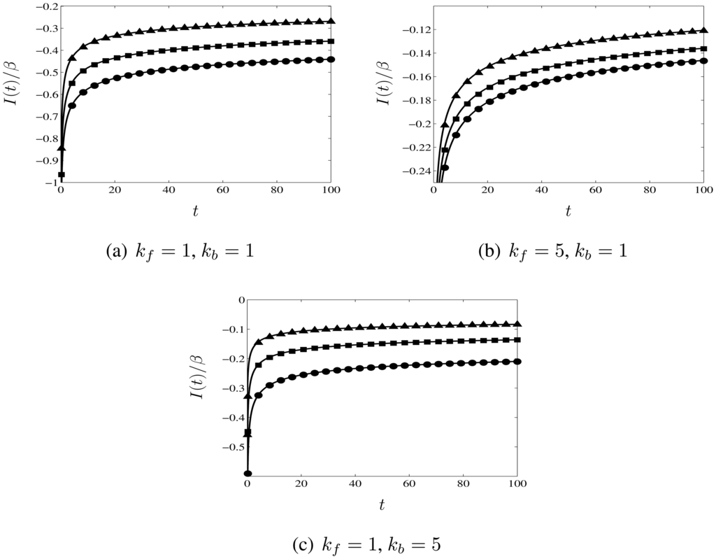 Plots of I(t)/β versus t for different rate constants: (a) kf = 1, kb = 1; (b) kf = 5, kb = 1; and (c) kf = 1, kb = 5. The solid lines are calculated using the approximate analytical expression in Equation (53) for the long-time current response, while the symbols are plotted from the results of the numerical calculations described in Section 3.3. The symbols correspond to different ratios of the diffusion coefficients: DO = 1, DR = 0.5 (triangles), DO = 1, DR = 1 (squares), and, DO = 1, DR = 2 (circles). It is apparent from the plots that the effect of unequal diffusion coefficients can be significant.