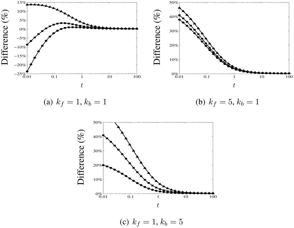 Log-linear plots of the time-varying percentage difference between the analytical expression given by Equation (53) for the current response and numerical results calculated as described in Section 3.3, using the same parameters as the plots in Figure 4: (a) kf = 1, kb = 1, (b) kf = 5, kb = 1, and (c) kf = 1, kb = 5. The symbols correspond to different ratios of the diffusion coefficients: DO = 1, DR = 0.5 (triangles), DO = 1, DR = 1 (squares), and, DO = 1, DR = 2 (circles). The analytical expression approaches the numerical results for longer times, when it becomes valid. For t ≥ 5, the maximum difference is less than 1.75% for all the parameters considered.