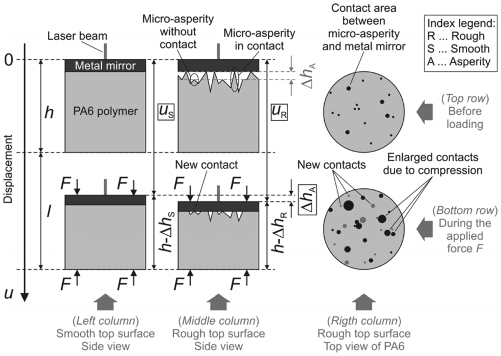 The measuring geometry of the samples at two time instances is presented in Figure 1. The top row shows the polymer sample with exaggerated micro-asperities and the metal mirror before loading, while the bottom row depicts a similar measuring geometry during the applied normal load F. A side view of the smooth sample is shown in the left-hand column, while the rough one is sketched in the middle column. The right-hand column shows the top view of the rough sample.