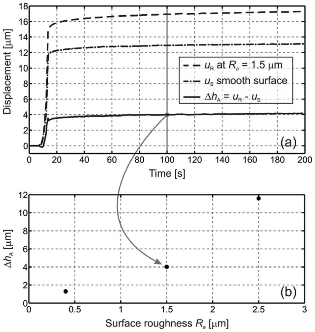 The value of ΔhA at 100 s [the solid vertical grey line in Figure 4(a)] is shown as the middle measured point in Figure 4(b). In addition, similar results for the surface roughnesses Ra = 0.40 μm and Ra = 2.50 μm are presented in Figure 4(b). The collective micro-asperity deformation increases with increasing surface roughness.