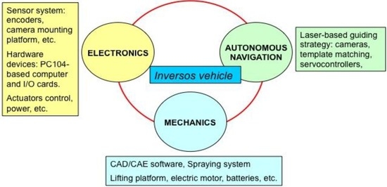 This vehicle is different from the successful project Fitorobot developed previously at the University of Almeria [15]. Being an electric vehicle, it therefore eliminates Fitorobot's disadvantages such as the emission of gases inside the greenhouse, which can be toxic to humans, and it minimizes noise. It also has wheels that reduce soil damage caused by the Fitorobot tracks.