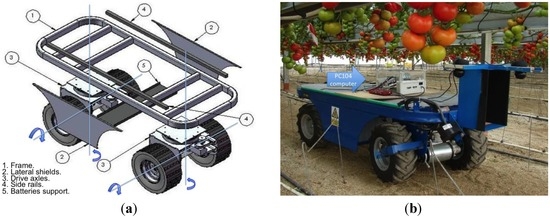 - Sánchez-Hermosilla, J.; Rodríguez, F.; González, R.; Guzmán, J.L.; Berenguel, M. A Mechatronic Description of an Autonomous Mobile Robot for Agricultural Tasks in Greenhouses. In Mobile Robots Navigation; Barrera, A., Ed.; InTech.: Rijeka, Croatia, 2010; pp. 583–608. [Google Scholar]