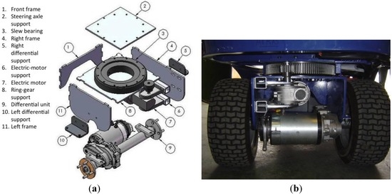Each axle is attached to the vehicle frame with a slew bearing that is driven by a DC electric motor (Figure 3(a)). The slew bearing has 300 mm pitch diameter, 120 teeth, and module of 2.5 (model VE030A00, La Leonessa S.P.A, Carpenedolo, Brescia, Italy). The DC electric motor has 350 W (Edon motors S.L, Vallirana, Barcelona, Spain). An 18-tooth gear and module 2.5 is used to transfer the motor power to the slew bearing.
