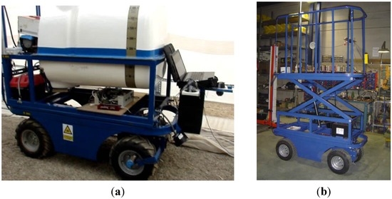(a) Vehicle equipped with the spraying system (phytosanitary tank). (b) Vehicle equipped with the lifting platform (extended).