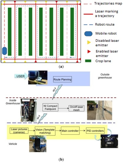 The navigation scheme, shown in Figure 5(b), is composed of two main layers, each running in different places and computers. First, there is a software application to manage the laser mesh in the greenhouse; this software runs in a computer located outside the greenhouse. All laser emitters are wired to a NI Compact FieldPoint® module which communicates with the computer. The user selects the route, i.e., the sequence of laser emitters that will be activated, then these data are sent to the Compact Fieldpoint module. When the vehicle is moving communicates with the FieldPoint module, which activates the next laser emitters in the sequence. Note that in this way, human operator is needed only once (selection of reference path), and even better, no human operator is needed inside the greenhouse, which is very advisable for spraying tasks.