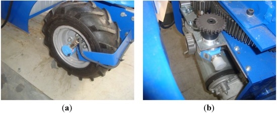 The propulsion system needs to be easy to control, supply, and install. The maximum travel speed is fixed at 1.5 m/s to allow good control of the vehicle inside the greenhouse. Two drive axles driven by a S21-ME differential unit (Metalrota, S.r.l., Modena, Italy) are used. Each S21-ME differential unit (Figure 3) has a gear ratio of 32:1, an output torque of 400 Nm and is driven by a DC electric motors of 24 V and 900 W. Two traction batteries of 12 V and 170 Ah are used for the power supply. This calculation took into account the weight of the vehicle with the payload (about 500 kg), under the assumption that the vehicle is travelling on a soft soil surface at a slope of 7% and an acceleration of 0.38 m/s2. It also assumes that the sprayer pump is powered separately. It is important to remark that working with the vehicle under the maximum payload (500 kg), at maximum travel speed (1.5 m/s), and in continuous operation, using the 4-wheel-drive configuration, the batteries last 65 min and using the 2-wheel-drive configuration, the batteries last 130 min. However, if the vehicle moves in a non-continuous operation, it could operate for a longer time, even several days.