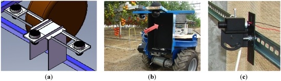 (a,b) Camera mounting platform in the front part of the vehicle. [20] Note the red laser point in the front dartboard. (c) Laser emitter installed in a greenhouse.