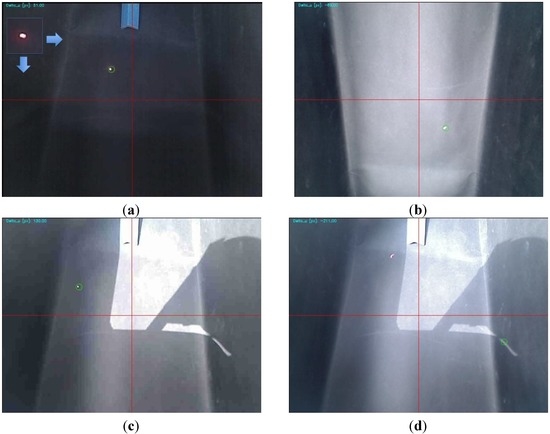 For detection of the laser point, two approaches have been tested. Firstly, an RGB-filter-based approach was tested [20]. The main drawback of that approach is that it looked for the laser point within a static fixed threshold in the RGB colour histogram of the image. Then if laser point was not inside this range it was not detected. Secondly, a template-matching approach was tested. This method is defined as the process of locating the position of a sub-image inside a larger image. The sub-image is called the template and the larger image is called the search area [21,22]. This process involves shifting the template over the search area and computing the similarity between the template and a window in the search area. There are several methods to address the template matching. In this case, the cross-correlation solution has been implemented. It is based on calculating an array of dimensionless coefficients for every image position (s,v):