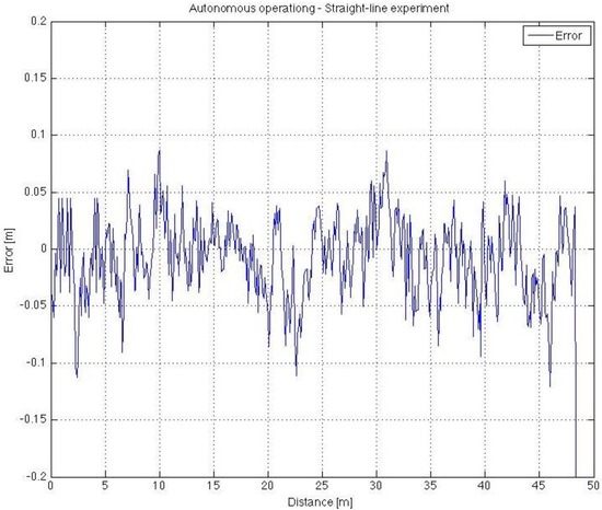 After the installation and testing of the laser emitters and of the NI Compact FieldPoint® module, several tests of the vehicle were made under autonomous operation conditions. Figure 9(c) shows the vehicle moving autonomously in a greenhouse (corridor length 50 m). Videos on the automatic operation of the vehicle can be seen in the following link: http://aer.ual.es/ramon/cta/videosCTA.htm. Note that for these preliminary experiments a laptop was used for controlling the vehicle (in the future the PC104-based computer will be employed instead). Figure 10 shows the deviation between the vehicle and the centre of the front dartboard, which must be aligned with the centre of the corridor (the laser emitter is just in the middle of the corridor). In this case, the vehicle follows properly the greenhouse corridor with very small corrections (mean = −0.09 m, mode = −0.04 m). Note that the corridors of this greenhouse were 1 m wide, then the maximum deviation of 0.1 m does not lead to any crop damage (recall that the vehicle is 0.71 m wide). It is important to point out that low-level controllers (PID) were not properly tuned, for that reason the vehicle oscillates along straight path. Future work will be devoted to adjust again these PID controllers.
