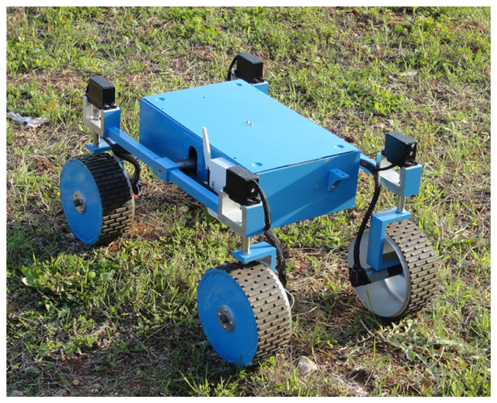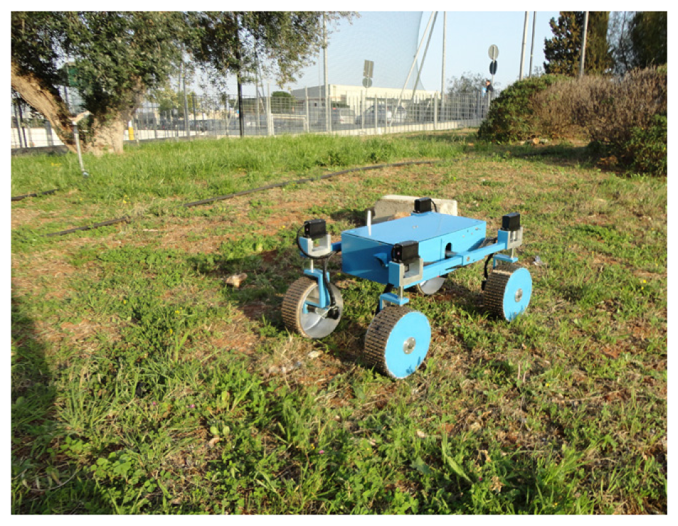 In this section, experimental results are presented to validate the proposed cross-coupled control approach. The system was integrated with the rover Dune (see Figure 1) and demonstrated in a rural environment at a University of Salento's test facility. The test field, shown in Figure 6, was mainly composed of relatively even agricultural terrain with sparse low grass and rocks of small-medium size. During the experiments, the rover was remotely driven by a human operator as the onboard computer gathered encoder, potentiometer and gyroscope information for subsequent off-line analysis.